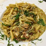 Penne with chicken breast, mushrooms, fresh tomatoes & sun-dried tomatoes in our creamy pesto gorgonzola sauce.