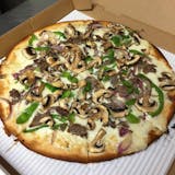 Pepperoni, salami, ham, bell peppers, onions, black olives & mushrooms.